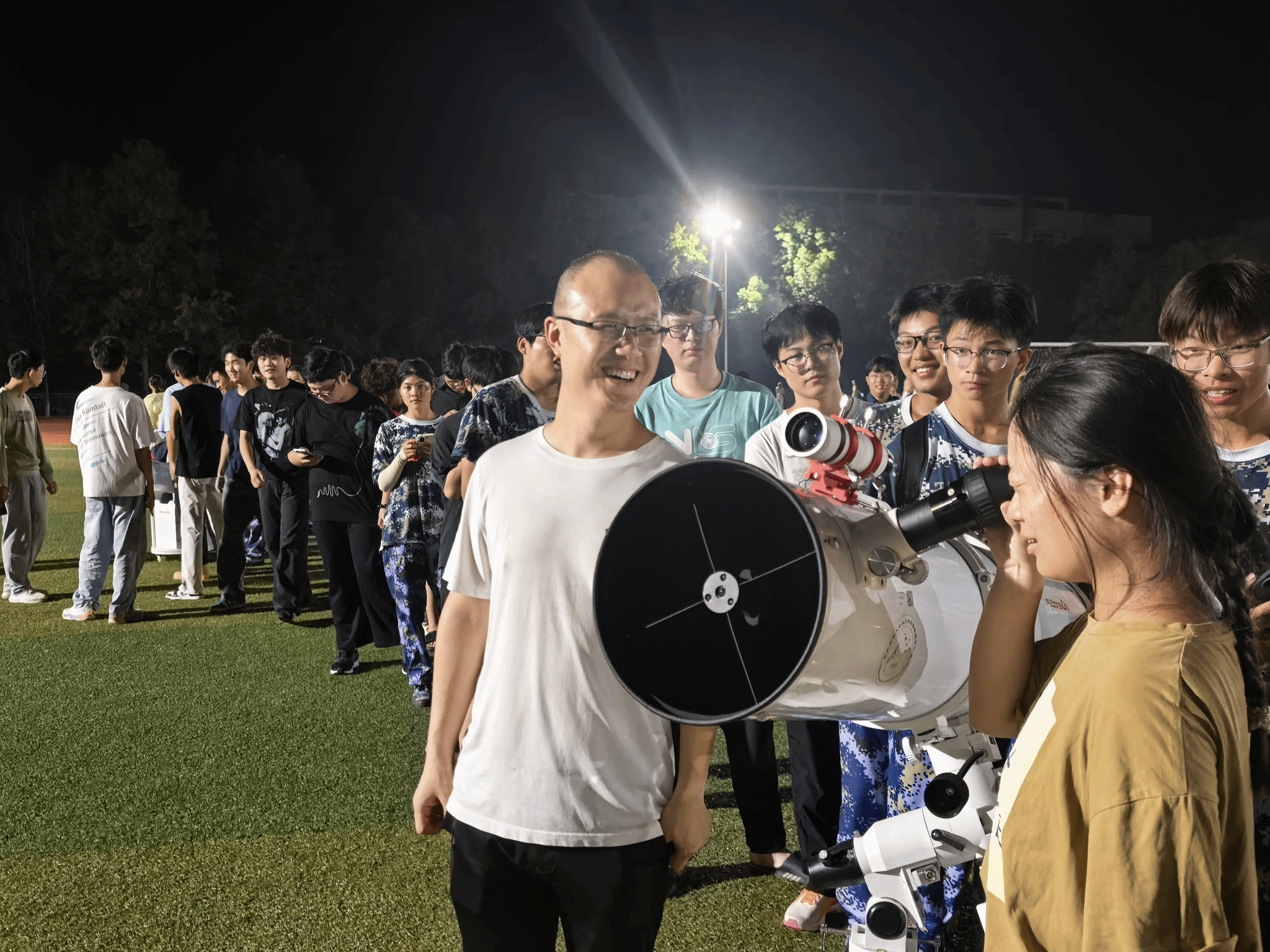 9月27日,中秋月近,国庆将至,安庆师范大学校园内洋溢着浓厚的节日氛围。数理学院物理学教师党支部联合大学生天文爱好者协会,成功举办以“迎中秋、庆国庆”为主题的“中秋之夜”全国科普月精品活动,并同步开展天文观测公益科普服务。活动吸引了约5000名师生热情参与,现场人潮涌动,星光与灯火交相辉映,共同绘就一幅青春与科学交融的动人画卷。