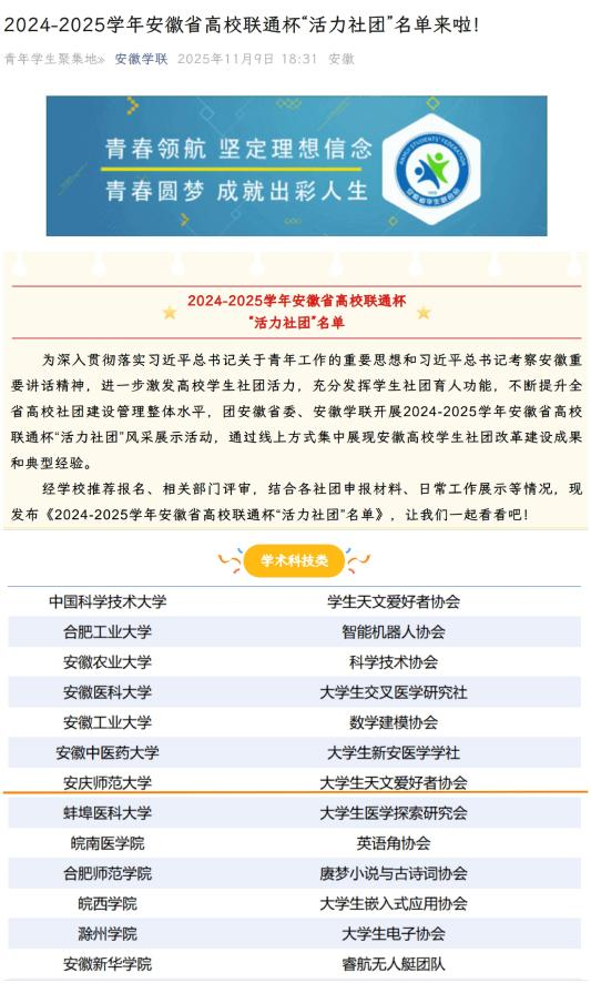 近日,数理学院大学生天文爱好者协会在2024-2025学年安徽省高校联通杯活力社团风采展示中,入选学术科技类活力社团。