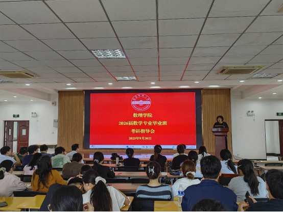 9月30日,数理学院在401报告厅举办数学类专业2026届毕业生考研指导会。数理学院院长助理陈文兵、数学系主任舒阿秀、信息计算科学系主任吴超云、统计系主任程文韬、学科数学硕士点负责人马宗立、信息计算教研室主任龙永尚、数学类专业2026届考研学生参会。会议由舒阿秀主持。