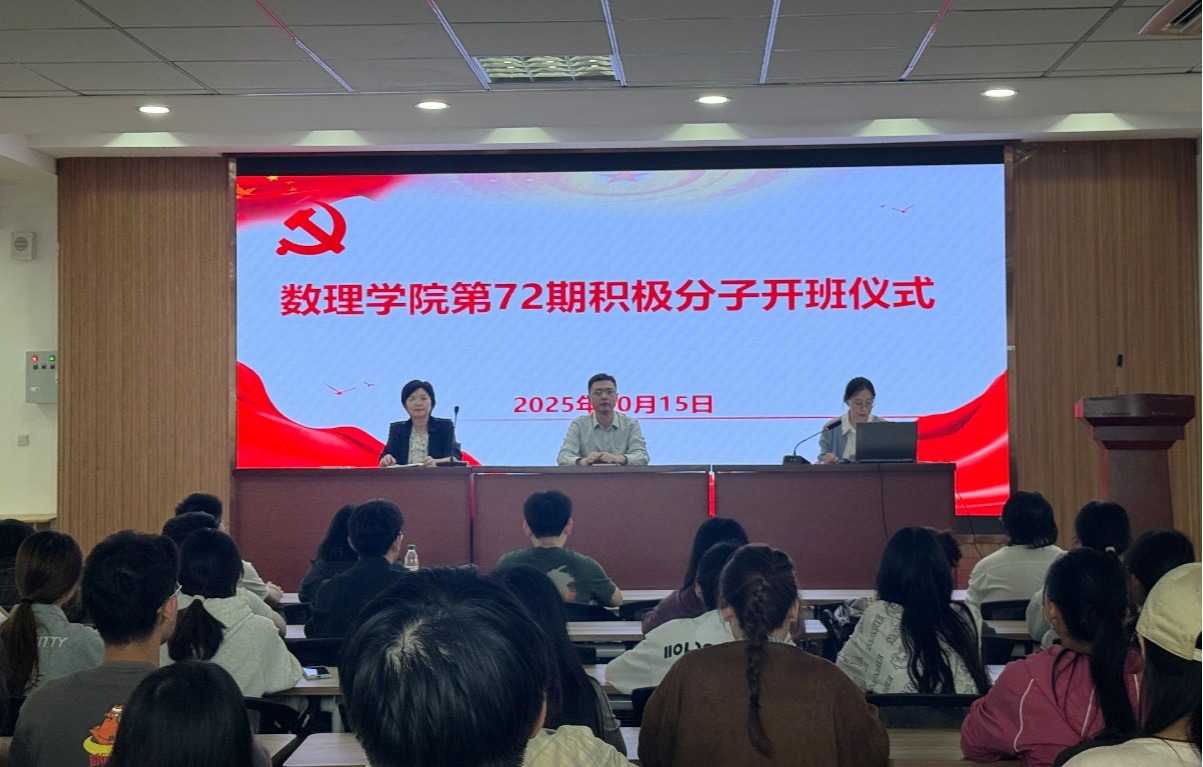 10月15日,数理学院在数理楼I401报告厅举行第72期入党积极分子培训班开班仪式。数理学院党委书记陆健、党委副书记彭芳珍、培训班班主任张娟及93名入党积极分子参加开班仪式。