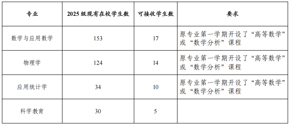 为支持学生的个性化发展与专业自主选择,数理学院于2025-2026学年继续开展转专业工作,以更好地满足学生的成长需求。具体方案如下: