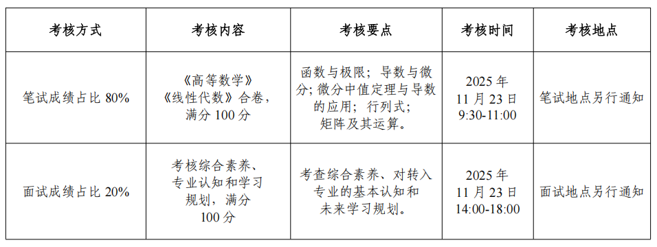 考核环节分笔试和面试。根据笔试成绩,数理学院从高分到低分按1:1.2的比例确定参加面试学生名单。具体考核安排如下: