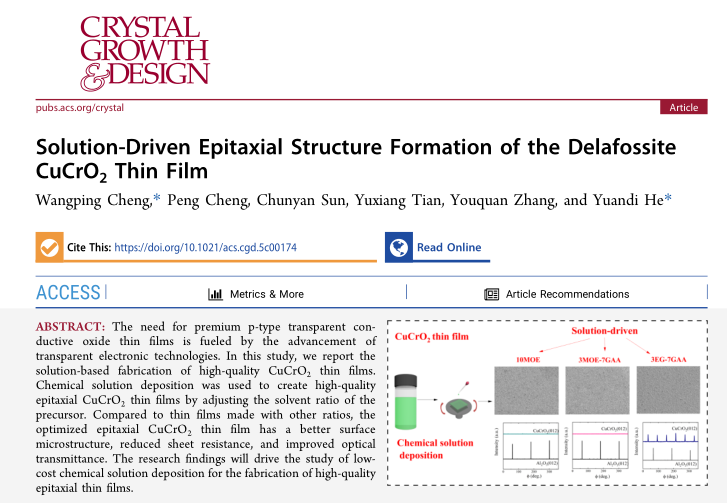 近日,数理学院程王平博士团队在《Crystal Growth & Design》发表论文“Solution-Driven Epitaxial Structure Formation of the Delafossite CuCrO2 Thin Film”,程王平博士为该文第一作者,何媛娣博士为该文通讯作者。该期刊影响因子IF=3.4,JCR一区期刊,中科院一区期刊。