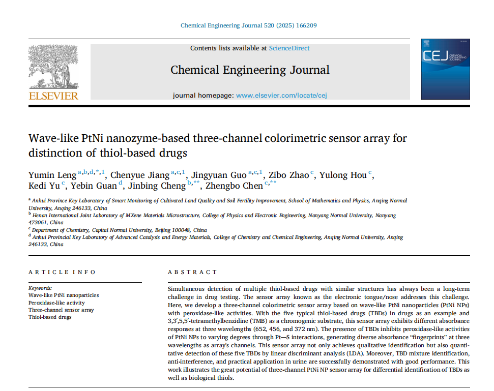 近日,数理学院冷玉敏教授团队在国际学术期刊《Chemical Engineering Journal》上发表SCI论文“Wave-like PtNi nanozyme-based three-channel colorimetric sensor array for distinction of thiol-based drugs”,该项研究工作与首都师范大学陈郑博教授课题组、南阳师范学院程晋炳副教授合作完成。冷玉敏教授为第一兼通讯作者,安庆师范大学为第一单位,该期刊影响因子IF=13.2,JCR一区,中科院一区TOP期刊。