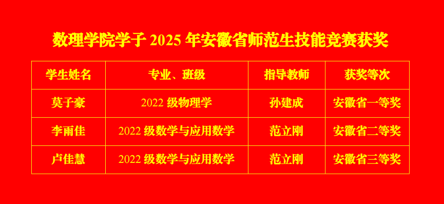 11月1日至2日,安徽省2025年高等学校师范生教学技能竞赛顺利举行并圆满落幕。数理学院学子在比赛中表现优异,莫子豪同学斩获中学物理组一等奖,李雨佳同学和卢佳慧同学分别荣获中学数学组二等奖和三等奖。