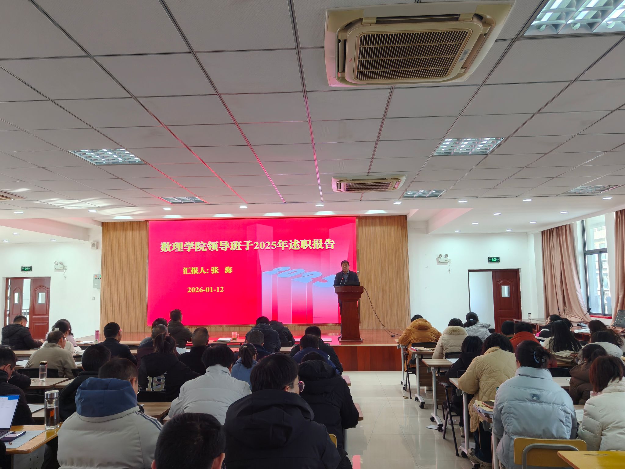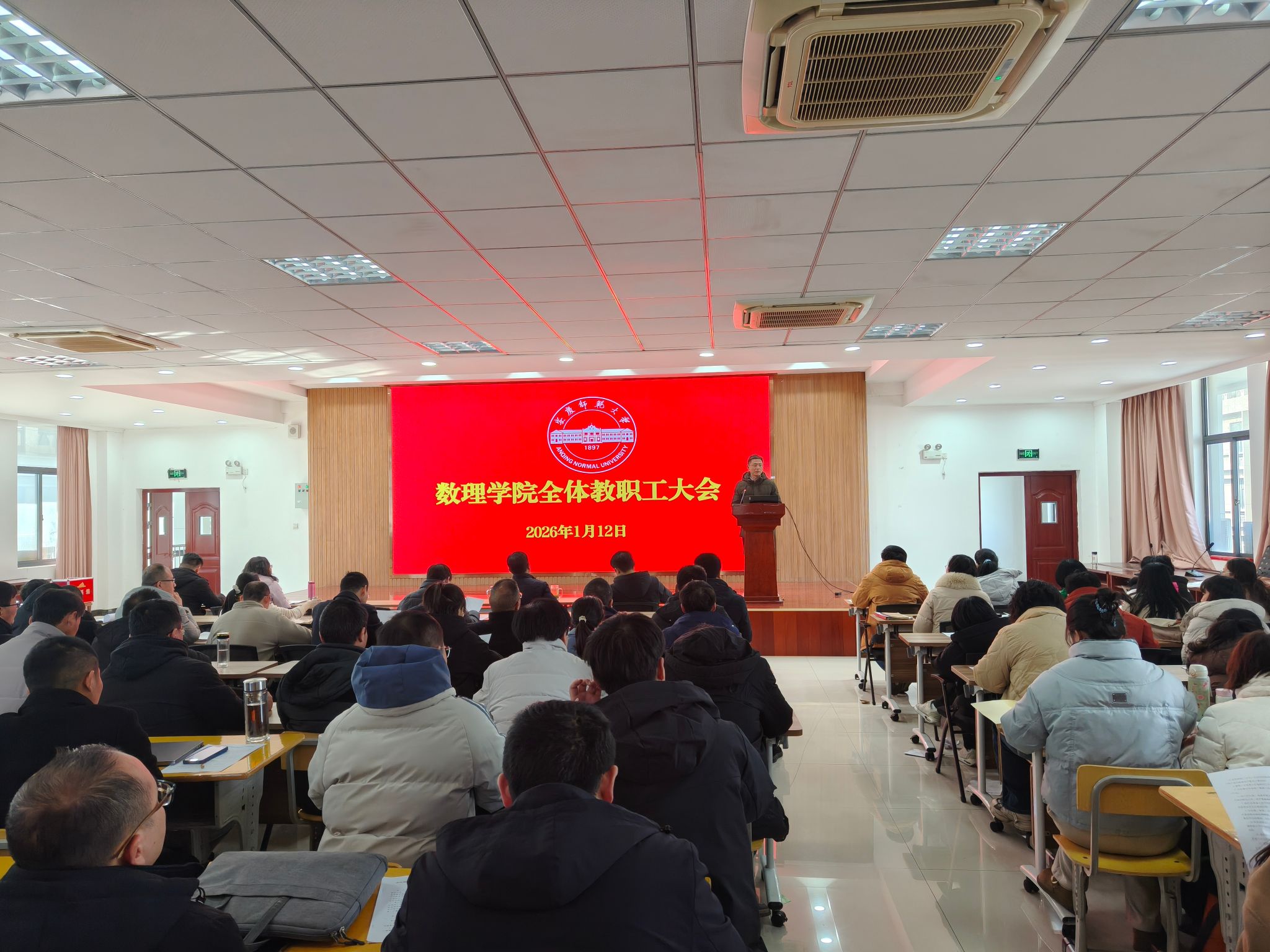 1月12日下午,数理学院在401报告厅召开全体教职工大会,总结回顾2025年度工作,部署期末及寒假重点任务。数理学院党委书记陆健,院长张海,副院长易明芳,党委副书记、纪委书记周刚,副院长陈文兵和全体教职工参加。会议由陆健主持。