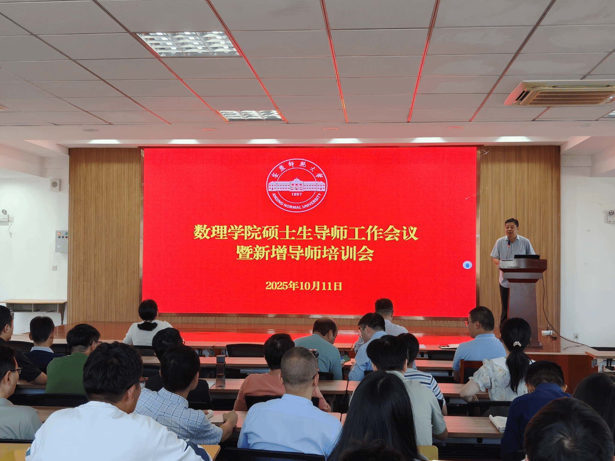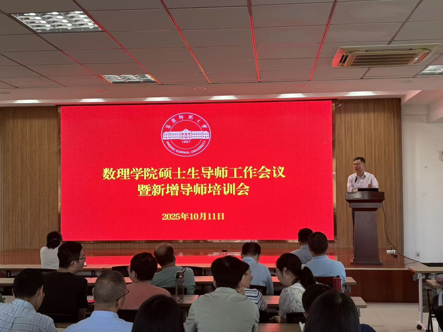 10月11日,数理学院在I楼401报告厅召开2025年硕士研究生导师工作会议暨新增导师培训会,数理学院党委书记陆健、院长张海、副院长易明芳、全体硕士研究生导师、近三年新入职博士、研究生秘书共100余人参加会议。会议由张海主持。