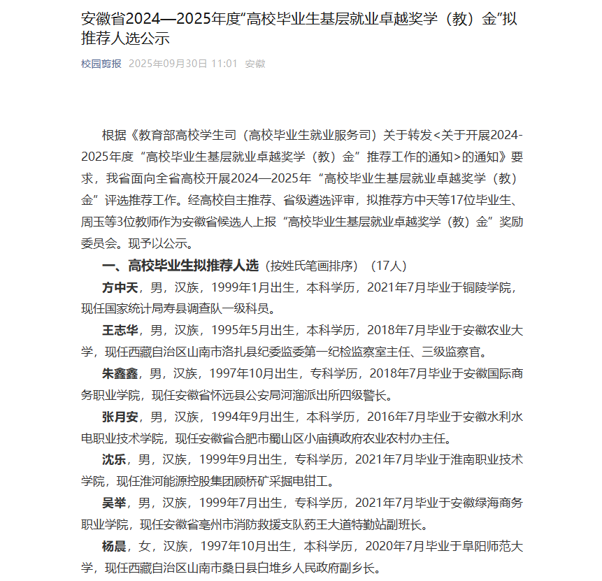 数理学院2016届毕业生谈鹏荣获安徽省2024—2025年度“高校毕业生基层就业卓越奖学(教)金”拟推荐人选